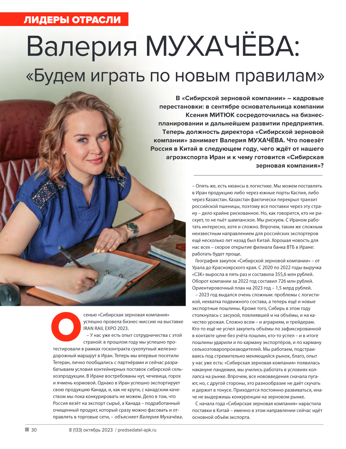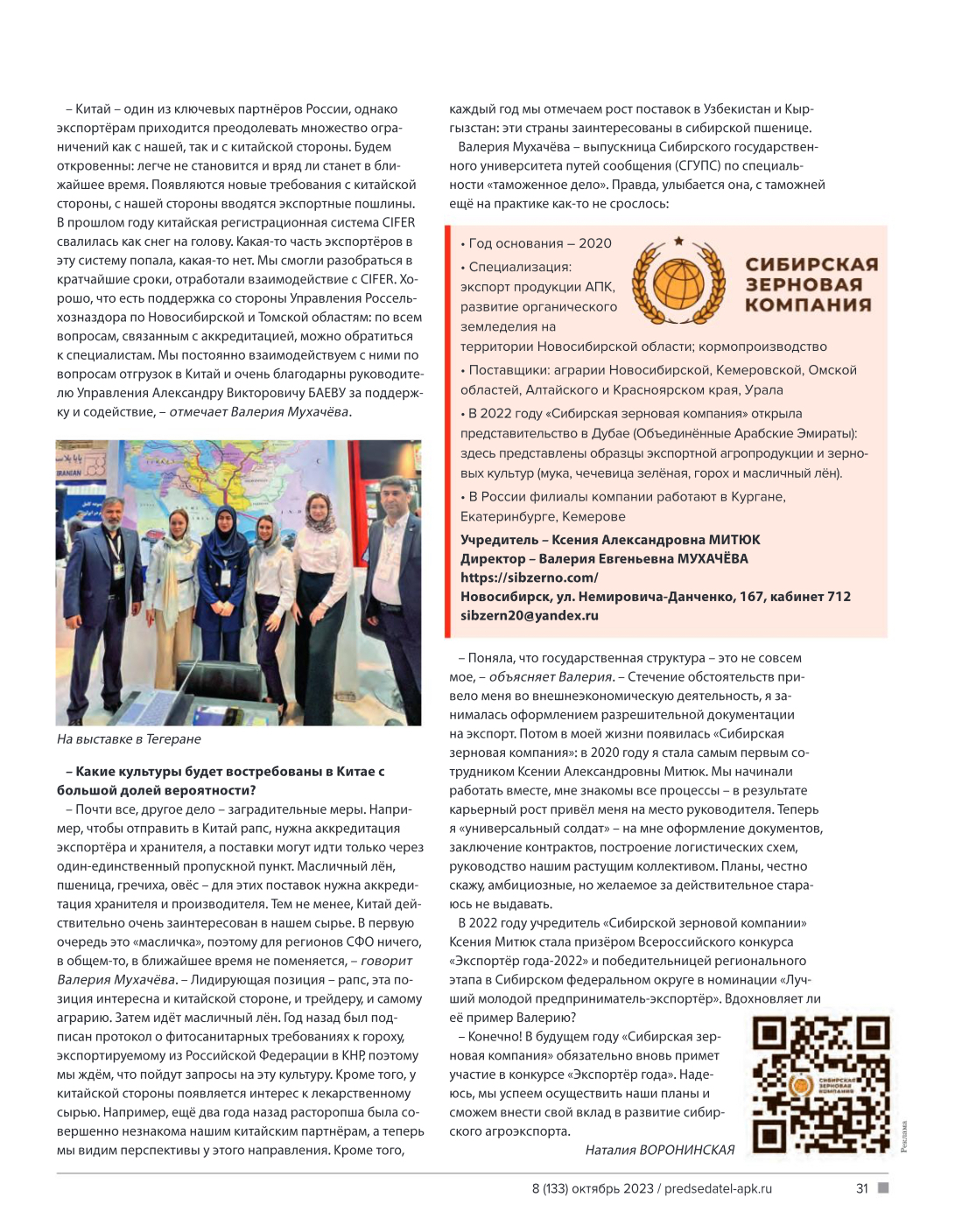 There are personnel changes at the Siberian Grain Company: in September, the company’s founder, Ksenia MITYUK, focused on business planning and further development of the enterprise. Now the position of director of the Siberian Grain Company is occupied by Valeria MUKHACHEVA. What will Russia bring to China next year, what does Iran expect from our agricultural exports, and what is the Siberian Grain Company preparing for?